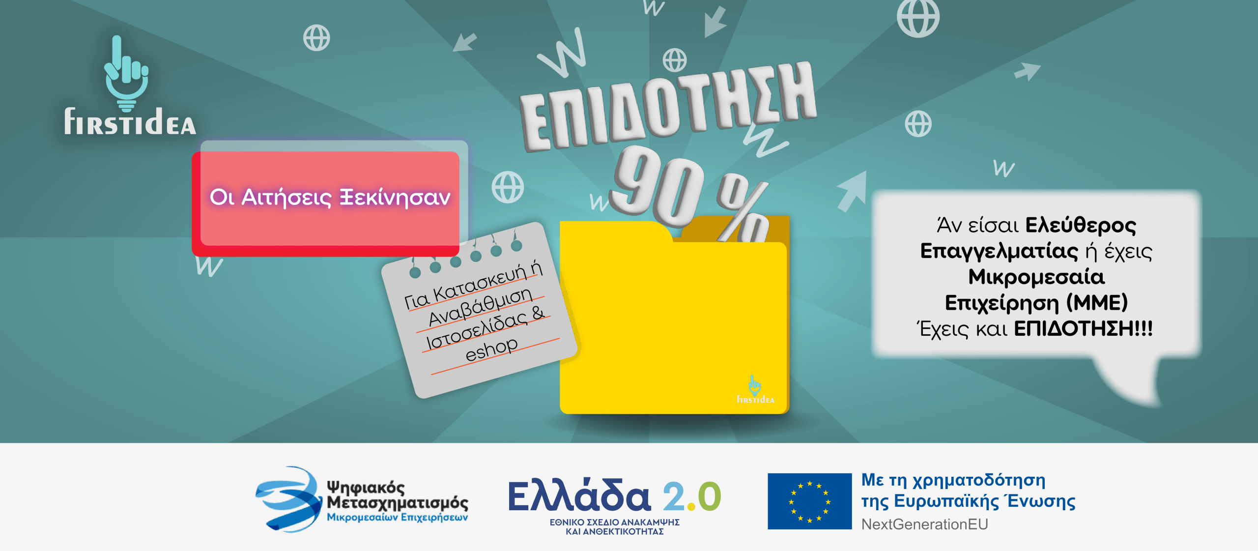 Το Πρόγραμμα «Ψηφιακά Εργαλεία ΜΜΕ Β’», που εντάσσεται στη δράση «Ψηφιακός Μετασχηματισμός Μικρομεσαίων Επιχειρήσεων», επιστρέφει ανανεωμένο, με επιδότηση voucher για έως 90% για την κατασκευή ή αναβάθμιση του ηλεκτρονικού σας καταστήματος. Η Firstidea είναι εδώ για να σας καθοδηγήσει σε κάθε βήμα της διαδικασίας, εξασφαλίζοντας ένα επαγγελματικό και λειτουργικό e-shop που θα εκτοξεύσει την ψηφιακή σας παρουσία.