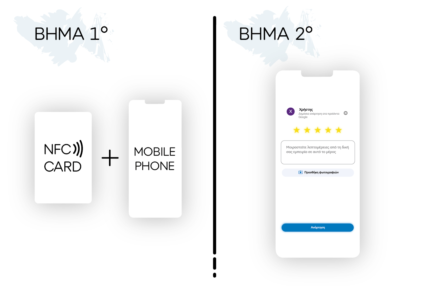 - Παραγγείλετε την κάρτα και μας στέλνετε το λογότυπο + link Google (ή εμείς δημιουργούμε το σύνδεσμο αξιολογήσεων).