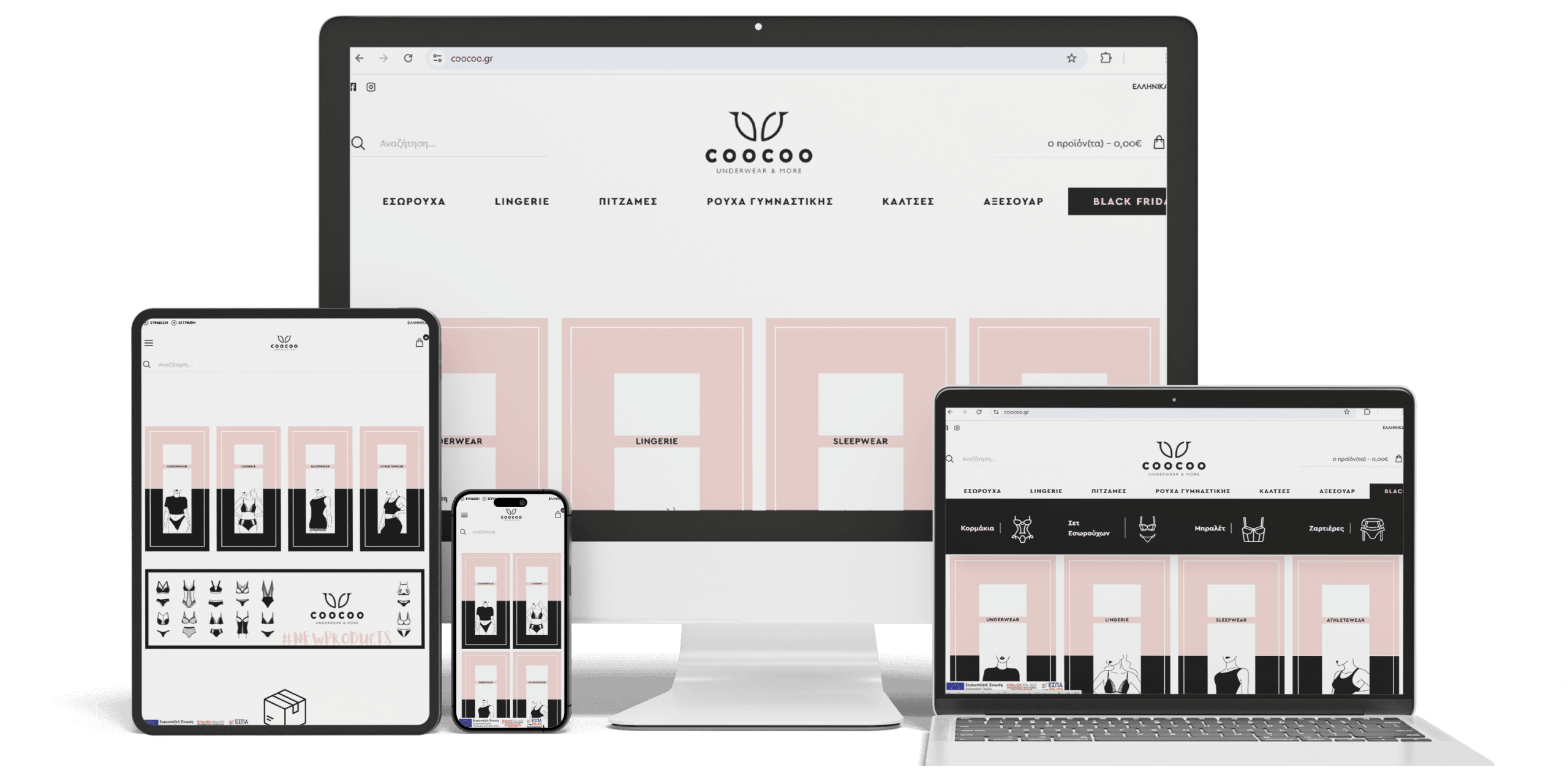 Το coocoo.gr είναι ένα eshop αφιερωμένο στη θηλυκότητα, το στυλ και την άνεση, προσφέροντας γυναικεία εσώρουχα, πιτζάμες, κάλτσες και homewear με ιδιαίτερο design. Η κατασκευή του ηλεκτρονικού καταστήματος πραγματοποιήθηκε σε OpenCart, με στόχο τη δημιουργία ενός καθαρού, μοντέρνου και εύχρηστου περιβάλλοντος, φτιαγμένου για να υποστηρίξει τη λιανική πώληση μέσα από ένα fashion-forward interface.