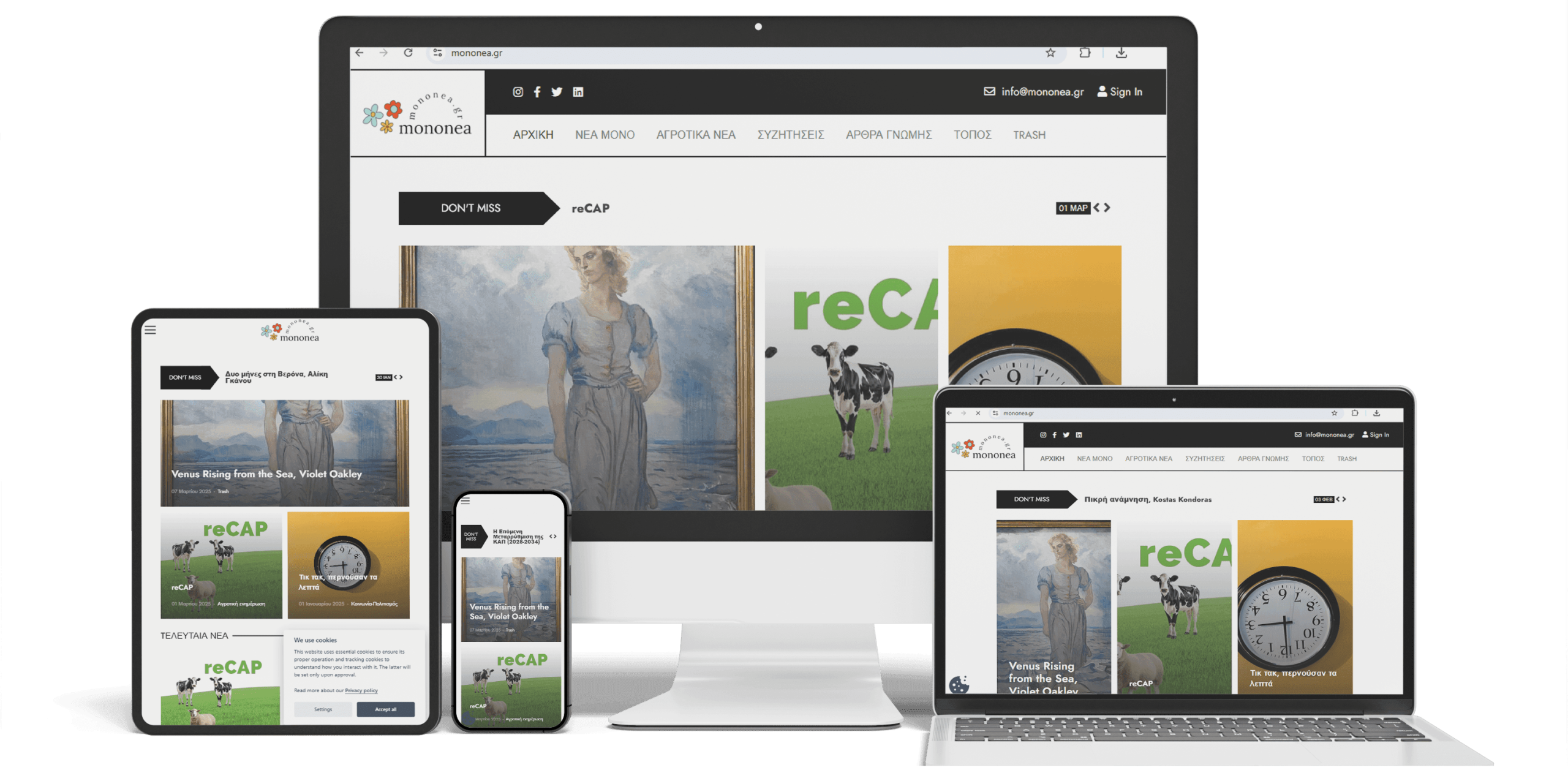 Το mononea.gr είναι ένα σύγχρονο ειδησεογραφικό portal με στόχο την άμεση, αξιόπιστη και πολύπλευρη ενημέρωση του κοινού σε θεματολογίες που αφορούν την επικαιρότητα, την κοινωνία, τον πολιτισμό, τον αθλητισμό και άλλα. Η κατασκευή της ιστοσελίδας πραγματοποιήθηκε σε Joomla CMS, αξιοποιώντας τις δυνατότητές του για διαχείριση μεγάλου όγκου περιεχομένου και τη δημιουργία ενός δυναμικού ψηφιακού μέσου.